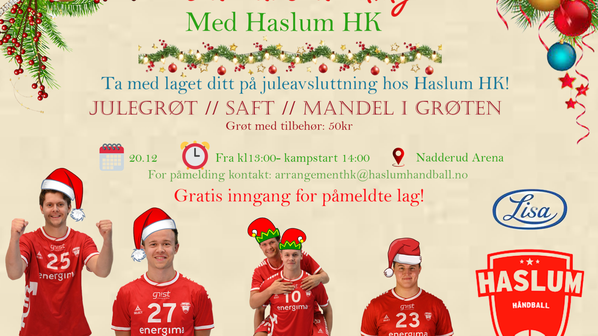 Ta på røde klær eller rød nisselue og kom i hallen og lag god stemning for spillerne i siste kampen før juleferie!